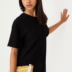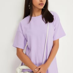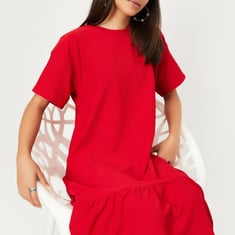 Dress your little diva in the delight of this solid dress, detailed with ruffles at the hem, drop shoulder sleeves, a round neck and an A-line silhouette. Style it with sandals and a sling bag.