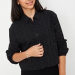 This Schiffli shirt-style top features delicate embroidery with a spread collar, button placket, and full sleeves with elastic cuffs. It blends classic tailoring with feminine charm for a polished yet breezy look.