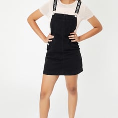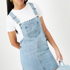 Upgrade her wardrobe with this solid-tone denim pinafore dress. It comes with adjustable printed straps and a straight hem, adding a stylish touch to her ensemble.