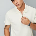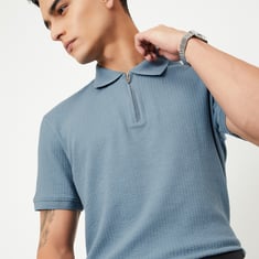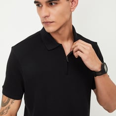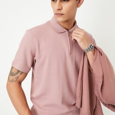 This T-shirt is the perfect balance of style and comfort. It has a polo collar, half sleeves, and a knit pattern. It has a zip closure and side slits to complete the look.