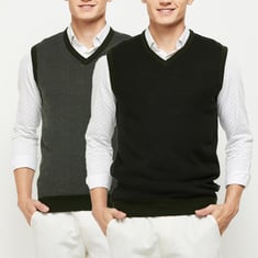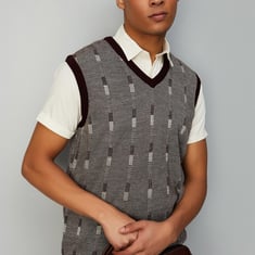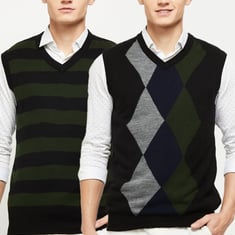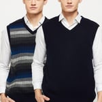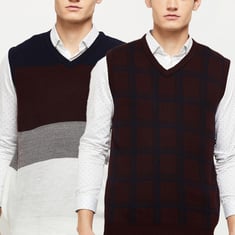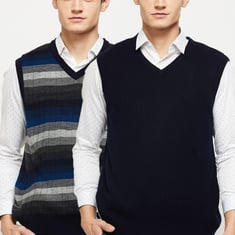 Get winter-ready with this sweater vest. This pullover comes with a knit pattern on one and stripes on the other to introduce versatility to your wardrobe. It is styled with a V-neck, sleeveless construction, and ribbed trim. To achieve a cosy, dapper look, layer this vest over a T-shirt and jeans.