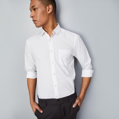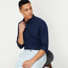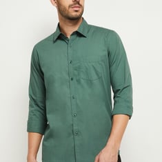 An ideal pick for your work wardrobe, this shirt is cut in a slim-fit profile. It is designed with a solid tone finish, a spread collar, full sleeves with buttoned cuffs, a patch pocket, and a curved hem.