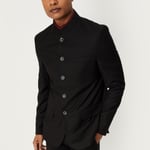 Nothing says suave like this blazer that is rendered in a solid tone. Crafted in a slim fit profile, it features a band collar, long sleeves, a buttoned front, back vents, a welt pocket at the chest, and flap pockets. Complete the classic ensemble with a formal shirt, trousers, and monk shoes.