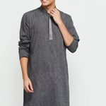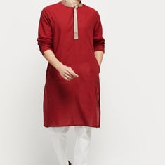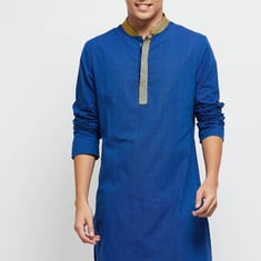 Add a fine ethnic touch in your style with this kurta, detailed with solid design, embroidered mandarin collar, full sleeves, and straight hemline.