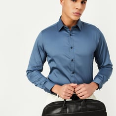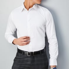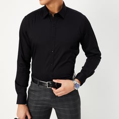 Upgrade your wardrobe with this solid shirt. It has a spread collar, full sleeves, buttoned cuffs, a curved hemline, and a button-down front. Its monochromatic design effortlessly suits both formal and casual occasions.