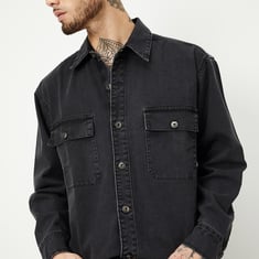 Elevate your style with this denim shacket. It features a washed finish and classic details like a spread collar, flap pockets and buttoned cuffs.