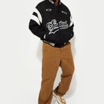 Level up your outerwear game with this varsity jacket. The sporty-inspired prints give it a standout look. It has a striped baseball collar, full sleeves, and waist pockets.