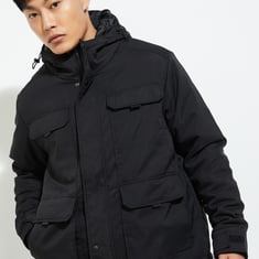 Level up your street style with this solid jacket. With four oversized utility pockets for that edgy vibe, full sleeves, side pockets and a hooded neck with a zip closure, this piece nails the perfect balance between street-ready and functional.