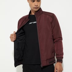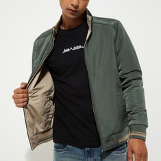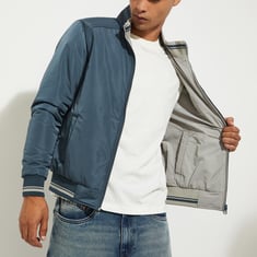 This solid reversible jacket combines style with practicality. It features a high neck, full sleeves, a zip closure, and striped ribbed hems for a sleek, sporty finish.