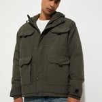 Stay adventure-ready in this men’s solid utility jacket featuring a hooded design, full sleeves, and a zip closure with a flap cover. It comes with four functional pockets for convenience and cuffs with Velcro adjustability for a secure fit. A perfect blend of style and practicality.
