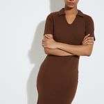 Seen having a ribbed texture, this knit dress features a fitted cut that elegantly contours your body, ending in a playful mini length. The collared neckline and short sleeves add a contemporary touch, making it versatile for casual outings.