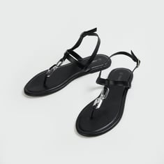 Elevate your ensemble with this pair of flat sandals. It has an open toe, a T-strap with chain accents, buckle closure at the back and a durable outsole.