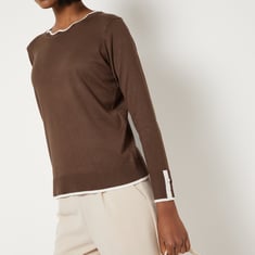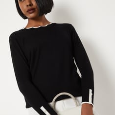 Elevate your wardrobe with this elegant top featuring contrast tipping details. Featuring a scalloped neck and full sleeves adorned with delicate pearl accents at the cuffs, it exudes subtle sophistication. Crafted in soft knit with rubbed trim and contrast detailing, it combines comfort with style.
