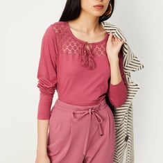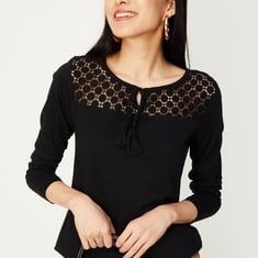 Give your everyday style an upgrade with this top. It is highlighted with a crocheted yoke. This top is styled with full sleeves and a tie-up neckline. For a laidback look, style this top with a pair of wide-leg trousers and ballerinas.