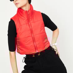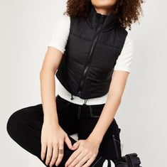 Layer up your style with this puffer jacket featuring a quiled design, mock collar, sleeveless profile, zip-front, and waist pockets. Style it with some cargos and chunky loafers.