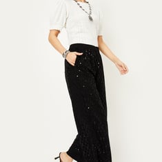 These embellished palazzos feature sparkling sequins, an elasticated waist for a comfortable fit, and convenient insert pockets. The wide-leg design offers a flowy, elegant look, while the sequins add a touch of glamour.