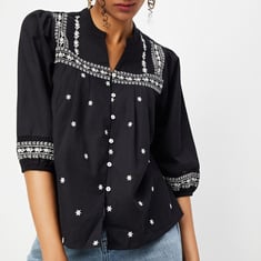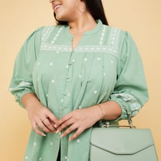 Paint a picture of elegance in this blouse. It is updated with a band collar, blouson sleeves, pleated detailing at the front, and a front button placket. The contrast embroidery and crochet insets add to the allure. Model Size :