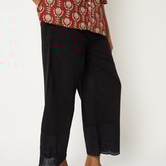 Stay comfortable and stylish with these embroidered hem palazzos, featuring a mid-rise elasticated waist and functional pockets for ease of wear. The delicate hem embroidery adds a subtle, elegant touch.