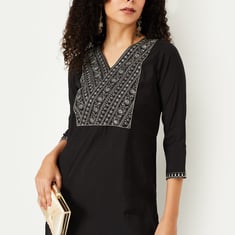 Discover timeless elegance with this embroidered straight kurta set. Featuring a v neck, 3/4th sleeves, side pocket, and side slits, the kurta offers both style and functionality. Paired with elasticated waist straight pants, it ensures comfort with a graceful finish.