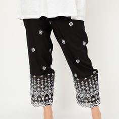 Ensure comfort while making your ethnic outfit stand out with these straight pants. They feature an embroidered design, a scalloped hem, and an elasticated waistline with a drawstring for a perfect fit.