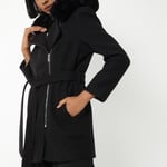 Stay warm and stylish with this fur hood longline jacket, featuring full sleeves, a zip closure, pockets, and a tie-up waist for a flattering, adjustable fit.