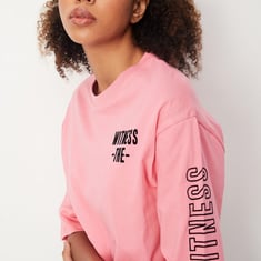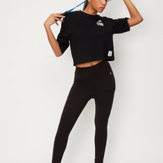 Stay motivated for workouts in this T-shirt featuring typographic prints. It is designed with a round neck, drop shoulders, elbow-length sleeves, and a crop profile. Look gym-ready by teaming up this tee with tights and sneakers.