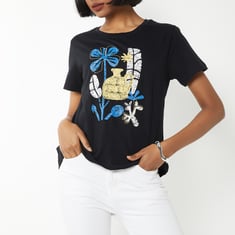 This printed t-shirt adds a charming touch to your everyday style with its soft prints and classic silhouette. Featuring a round neck and half sleeves, it's perfect for easy, all-day comfort.