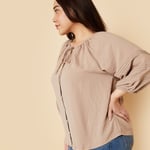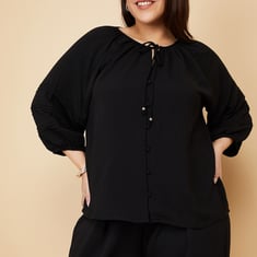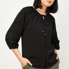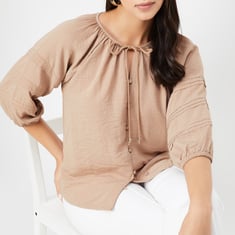 Embrace modern elegance with this blouse. The hammered design adds to the visual appeal. It has a tie-up neck, raglan sleeves with pintuck detailing, and a front button placket. Model Size :