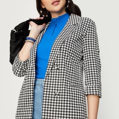 Flaunt is style by layering up with this houndstooth blazer. It is tailored with a notched lapel, button closure, three-quarter sleeves, and waist pockets. Layer it up with trousers and a blouse for an office-ready look.
