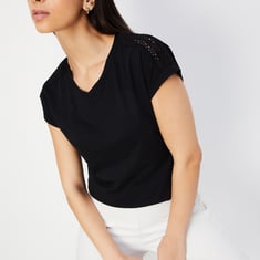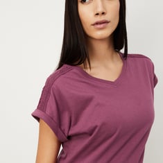 Spruce up your casual look with this T-shirt. Designed with a lace detail yoke, a round neckline, and extended sleeves with lace on shoulders, it adds a touch of elegance to your everyday style.