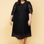 A perfect mix of dainty and chic, this fit and flare dress is updated with a lace overlay. It features a scalloped neck, three-quarter sleeves, eyelash trim, and a midi-length profile Pair this dress with block heels and a sling bag for an elevated look.