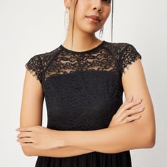 A timeless addition to your wardrobe, this fit-and-flare dress is highlighted with a lace bodice. It is styled with a round neck, cap sleeves, a zip closure, and a pleated skirt. Pair this dress with heels for a chic look.
