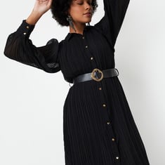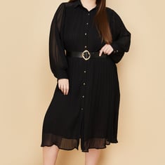 Flaunt your elegance in this shirt dress featuring a spread collar, full sleeves, and a belt. The pleated design lends a flowy and breezy look, adding to its charm and comfort. Perfect for both casual and semi-formal occasions, it combines style with ease for a versatile wardrobe staple.