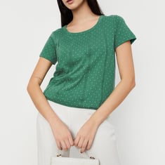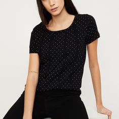 Elevate your casual look with this trendy polka dot t-shirt featuring half sleeves, a round neck, and an elasticated hem. Perfect for adding a touch of style to your everyday wardrobe.