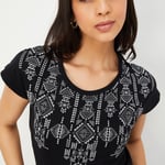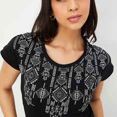 Give a boho-chic vibe to your look with this T-shirt. It is styled with a round neck, extended sleeves, and a straight hem. The graphic print at the yoke elevates the overall style.