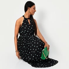 Summer evening calls for this elegant midi dress highlighted with all-over prints and a pleated skirt. It features a halter neckline with a tie-up at the back, a cut-out at the front, and a sleeveless construction. Pair this dress with flat mules to elevate the style.
