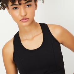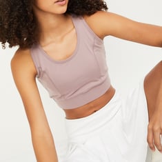 This solid sports bra offers comfort and support with a racerback design and elasticated hem for a secure fit. Perfect for workouts or active days.