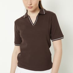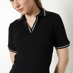 Upgrade your workout wardrobe with this slim-fit T-shirt, featuring a classic Johnny collar, ribbed detailing, and eye-catching contrast trim. The half sleeves and straight hem offer a clean, flattering silhouette.