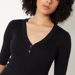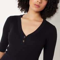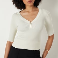 This ribbed top adds a modern twist to your wardrobe with its flattering V-neck design, complete with a stylish button closure. The half sleeves elevate the look, offering a blend of comfort and sophistication.