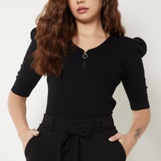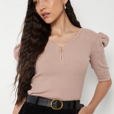 This top features a flattering V-neck with a sleek zip detail and half sleeves, giving it a modern edge. The ribbed texture adds definition, making it a chic upgrade to everyday basics.