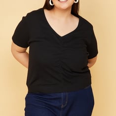 Elevate your casual wardrobe with this solid top that features a V-neck, half sleeves, and a ruched front. Model Size :