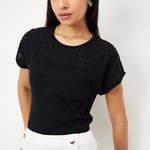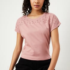 An ideal pick for your casual wardrobe, this top is highlighted with delicate schiffli detailing at the yoke. Featuring a round neck and extended half sleeves, it blends comfort with subtle elegance.