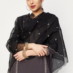 Jazz up your ethnic or fusion look with this dupatta highlighted with all embroidery and sequin embellishments. It is finished with a scalloped border for added style. Style this dupatta with a kurta or tunic set to add a hint of drama to your look.