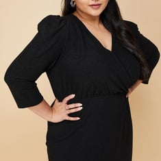 Wrap yourself in this glamourous party wear dress featuring shimmer overall detail, a surplice neck with three-quarter sleeves in knee length profile, and a bodycon silhouette adding flair to every step you take.