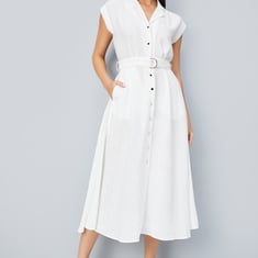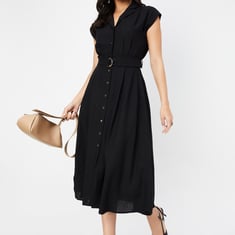 This solid A-line belted dress is a perfect blend of elegance and style, featuring a flattering midi length and a chic lapel collar. The button closure and half sleeves add a refined touch, making it a versatile piece for both casual and semi-formal occasions.