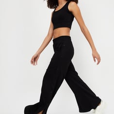 Blend comfort with style in these solid athleisure wide-leg track pants. Designed with an elasticated waist for a snug yet relaxed fit, they feature functional pockets for added convenience. The side slits with button accents add a trendy touch, making them perfect for both casual outings and active days.