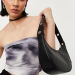 Infuse a Y2K-inspired look to your outfit with this crescent-shaped bag. It is designed with a solid shell and a compact zip compartment to stow your essentials. The handle is punctuated with grommet details for an edgy look.