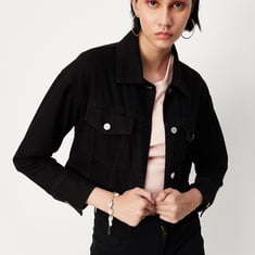 Up your layering game with this denim jacket in a solid tone. It features a spread collar, long sleeves, buttoned cuffs, double flap pockets with button closure on the chest, and a crop profile. Style this jacket with a tee and jeans to ace the look.