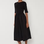 Step into timeless elegance with this dress. Featuring a round neck and half sleeves, it offers a classic and flattering silhouette. The gathered waist enhances the fit-and-flare shape, while the midi length adds graceful movement.
