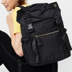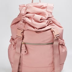 Perfect for your daily adventures, this backpack features a solid tone finish. It has adjustable backstraps, a top handle, and a front zip pocket. The flap features ruching on the sides and double press buckle closures, while the spacious main compartment is equipped with a draw cord top and a zip pocket.